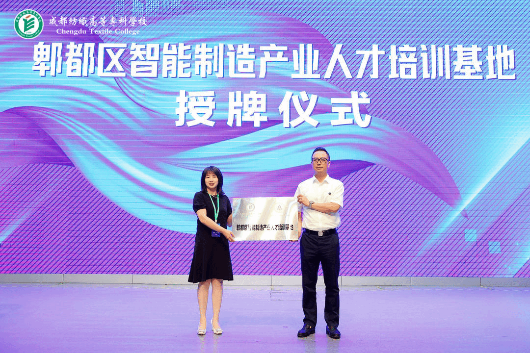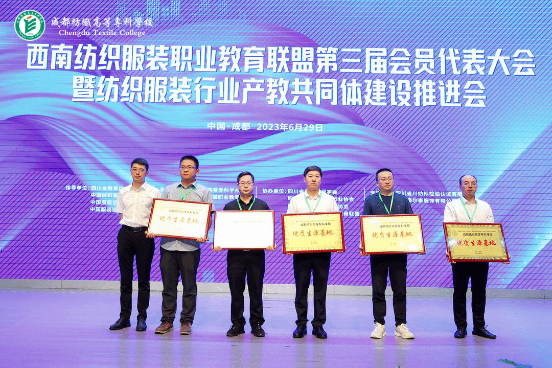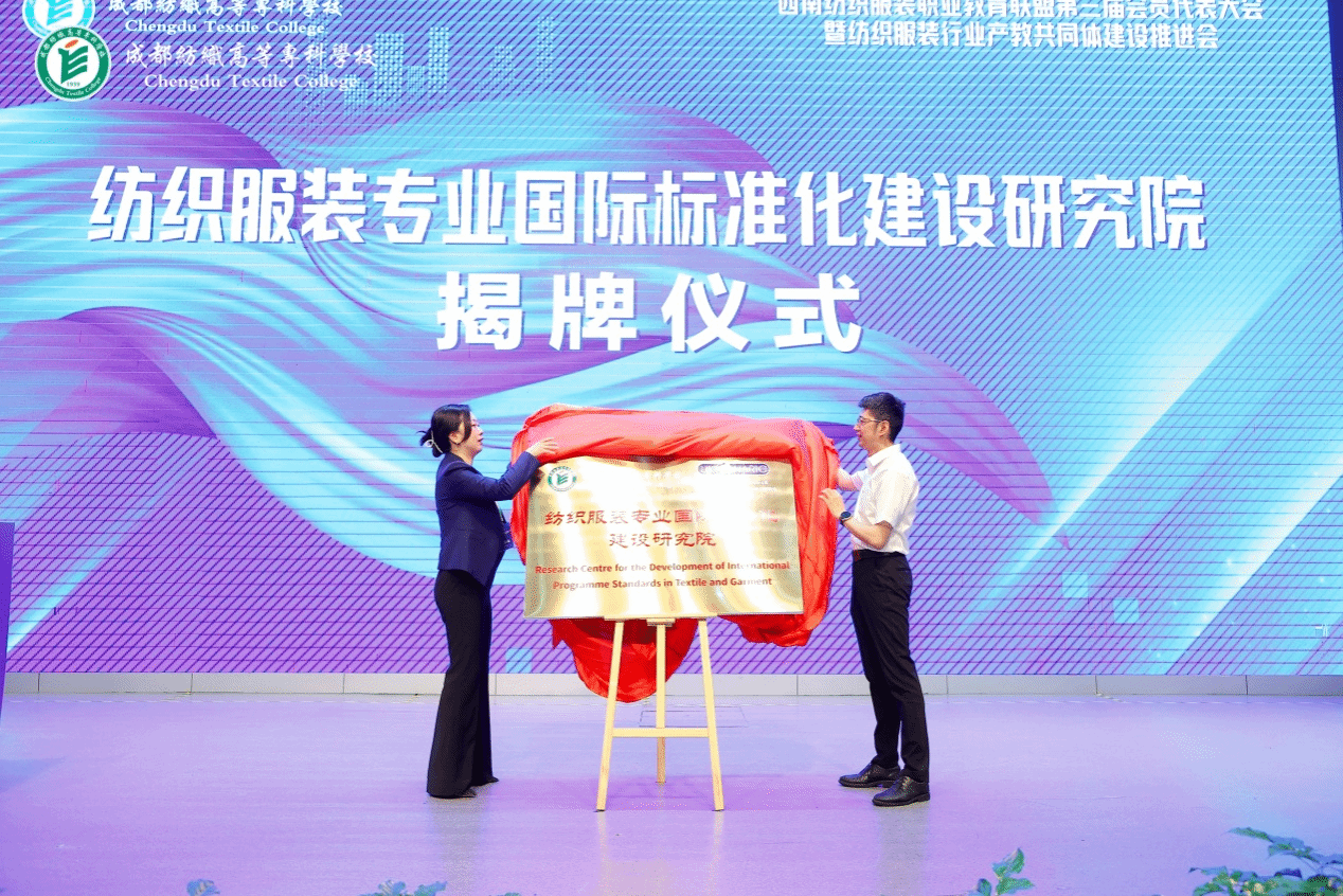 大会第二阶段。UK ENIC英国国家学历学位评估认证中心中国首席代表李华杰和我校副校长宋超共同为双方共建的纺织服装专业国际标准化建设研究院揭牌。宋超代表学校为四川省服装艺术学校、四川省广元市职业高级中学校、成都市现代制造职业技术学校、四川省成都市财贸职业高级中学校、四川省南江县职业中学5所院校授“优质生源供给单位”铜牌。郫都区智能制造产业协会秘书长刘虹授予我校“郫都区智能制造产业人才培训基地”铜牌,四川省城乡融合人才培育研究基金会青少儿教育公益基金服务站负责人张丽君授予我校“人工智能创新实验室”铜牌。大会通过视频展示了联盟致力于纺织服装大数据平台建设所取得的成果。川纺标项目负责人刁宇代表第三方独立检测中心,雷迪波尔公司副总裁卢山代表行业企业,渠县经开区党工委副书记冯全代表产业园区,四川省服装艺术学校校长杨健代表中职学校作交流发言,为联盟的发展建言献策。他们表示,将为纺织服装类莘莘学子们提供更高、更广阔的发展平台,推动纺织服装产业不断前进。