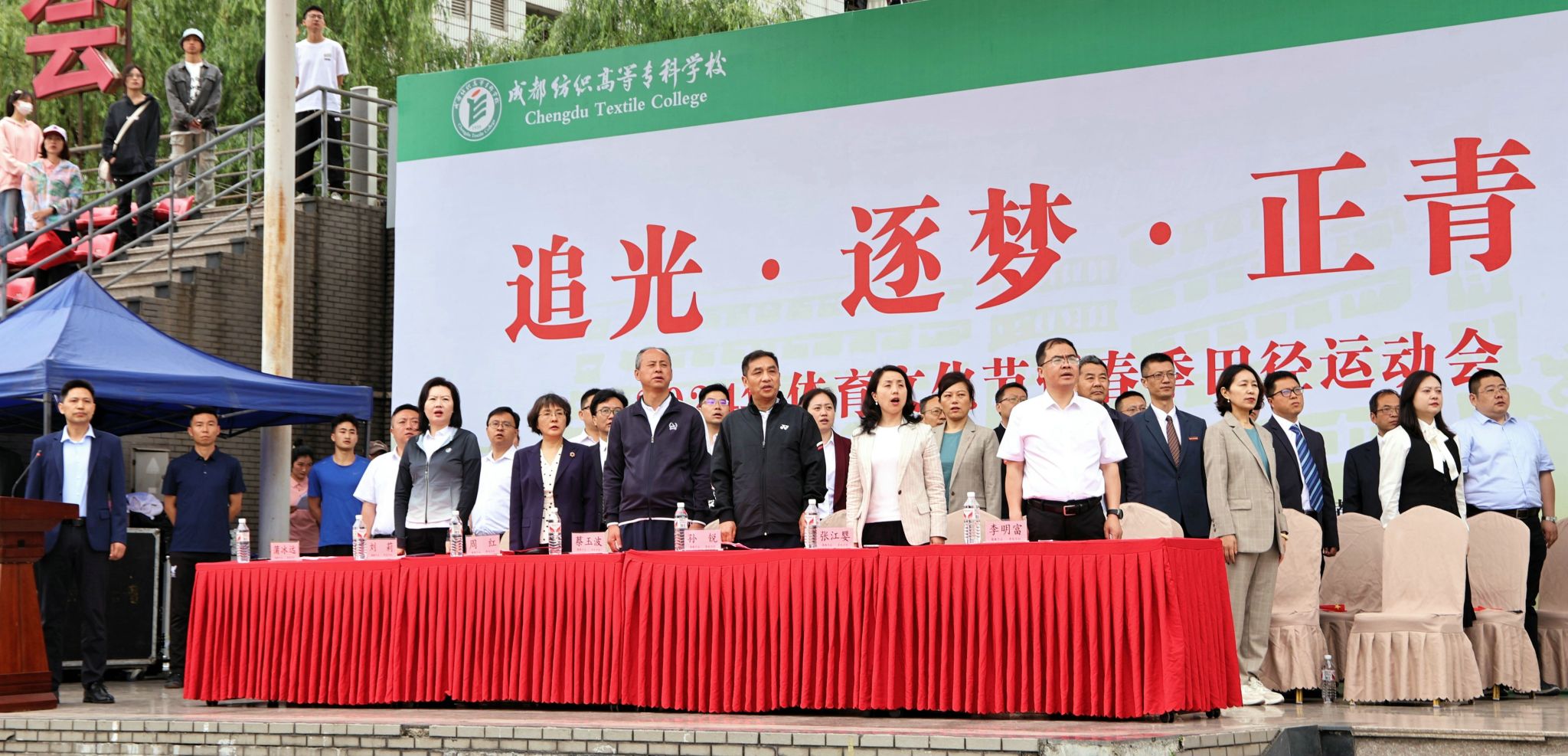 4月24日上午,成都纺织高等专科学校“追光·逐梦·正青春”2024年体育文化节暨春季田径运动会开幕式在南苑运动场正式举行,运动员、裁判员和师生观众数千人参加开幕式。学校党委书记蔡玉波宣布体育文化节开幕,校长孙锐致开幕辞,副校长蒲冰远主持开幕式。