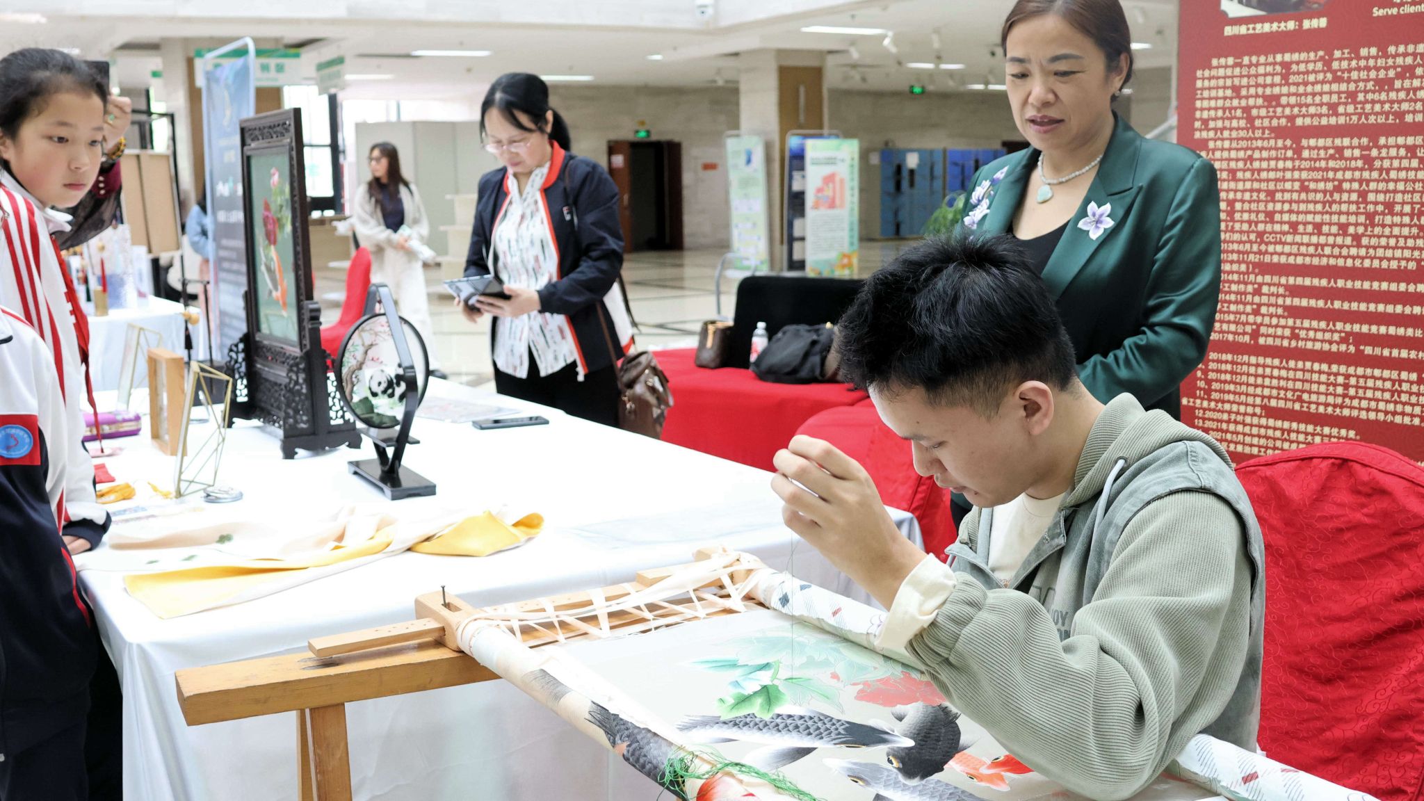 在图书馆一层大厅,郫都区、青白江区残联组织部分残疾人非遗文创作品开展了集中展示活动。精美的民族服装、无障碍服装、钩织作品、蜀绣屏风、文创羌绣、竹编茶具等作品,令观展的领导和师生叹为观止。