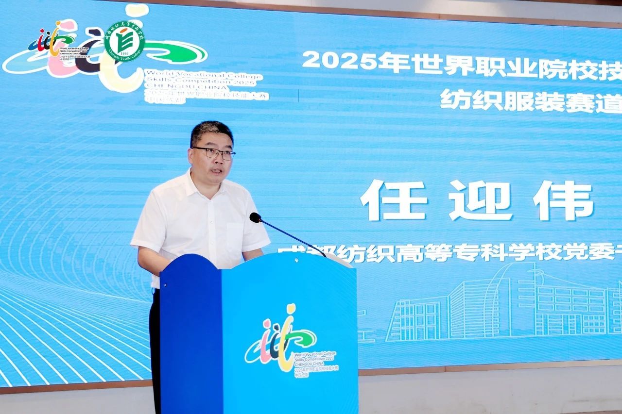 任迎伟在致辞中介绍了学校的办学历史、专业特色和育人成果。他表示,作为本次大赛的东道主,成纺人深感责任重大、使命光荣。学校始终秉持“以赛育人”核心理念,从赛场环境的精心布置到技术系统的精准配置,都严格对标前沿标准,倾力为所有参赛选手打造一个与世界先进水平接轨的卓越竞技平台。学校将恪守“公平、公正、公开”的竞赛原则,以饱满的热情、严谨的态度、周到的服务,全力以赴、精益求精,为所有参赛者营造安全、有序、温馨的竞赛环境,让这场竞技不仅成为技艺的比拼,更成就思想的碰撞与友谊的交融!