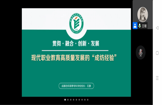 12月4日下午,校长石静应邀为四川省2022年职业院校教师培训项目——1+X证书制度种子教师培训(旅游服务与管理)班全体学员作《贯彻·融合·创新·发展——现代职业教育高质量发展的“成纺经验”》专题报告。报告会由文旅学院副院长王敏主持。