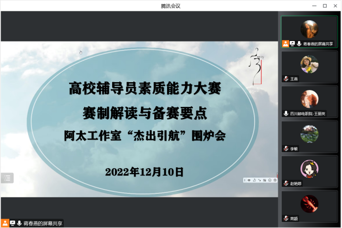 12月10日晚,学校阿太工作室召开“杰出引航”围炉会,第八届全国高校辅导员素质能力大赛一等奖获得者、四川邮电职业技术学院专职辅导员王丽英副研究员应邀在腾讯会议为我校辅导员作“高校辅导员素质能力大赛赛制解读与备赛要点”专题培训。