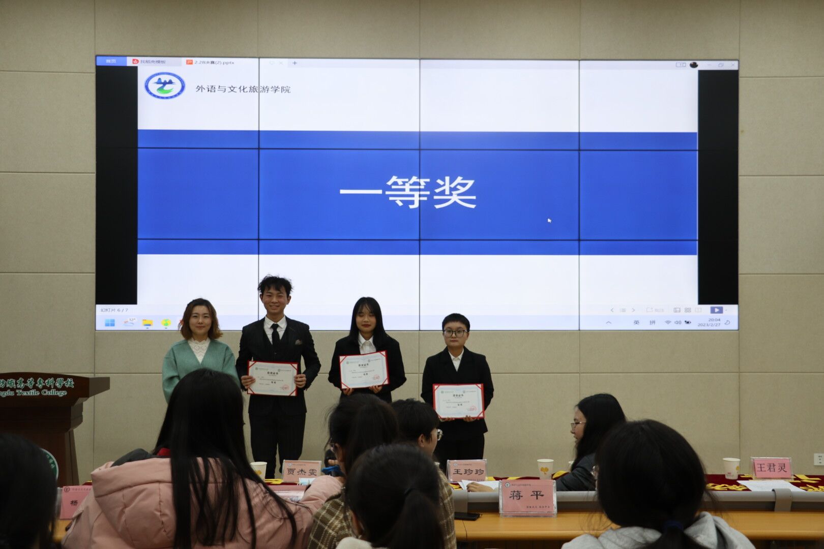 2月27日晚,文旅学院在综合楼一楼会议室举行“规划人生·成就梦想”大学生职业生涯规划大赛院级决赛。学生管理与就业创业处副处长刁家志应邀出席。文旅学院党总支副书记兼团总支书记王珍珍、专职组织员邓凯艳、团总支指导老师许梦雪以及辅导员贾杰雯、王君灵、蒋平、夏佳和杨宗英老师担任此次比赛的评委。