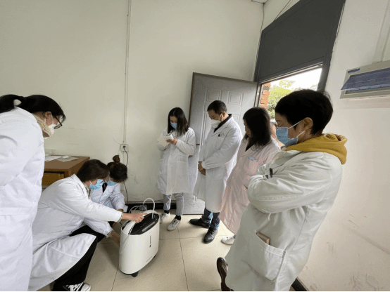 CPR理论学习结束后,护师赵雁斐带领大家继续学习如何操作制氧机,包括:制氧机的组件、安装、吸氧和雾化操作。最后大家轮流进行实操,以确保熟练使用。