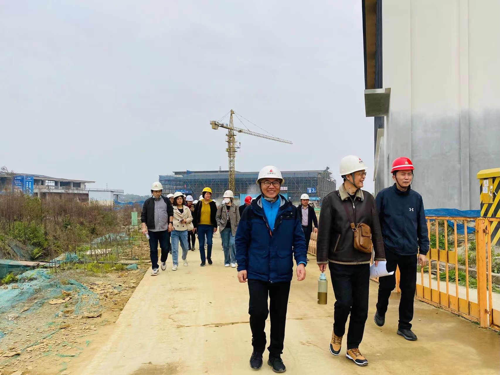 来到邛崃产教园区,大家第一时间戴上安全帽,园区建设负责人详细介绍了新校区整体设计规划及目前工程进度。在负责人的带领下,大家参观了教学楼、实训楼、食堂、教职工宿舍等地。