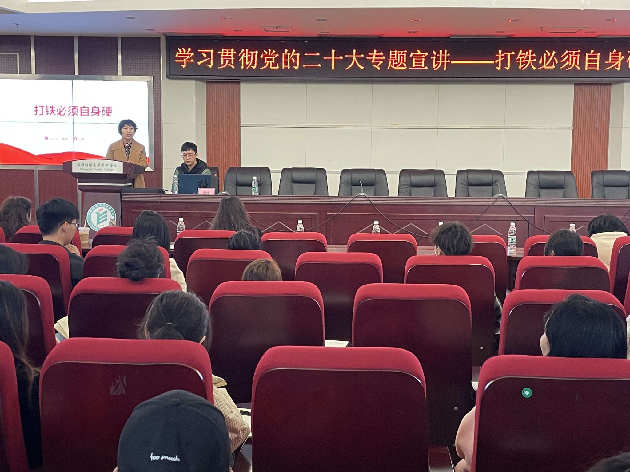 3月22日,服装工程与设计学院邀请学习贯彻党的二十大精神西南交通大学师生巡讲团成员博士生胡持为学生党员作党的二十大精神专题宣讲,加强思想引导,强化朋辈引领,助推“三全育人”,培育时代新人。宣讲会由学院专职组织员李梅主持,学院党总支书记太扎姆、副书记赵爽,全体专职辅导员,学校部分师生代表共180余人参会。
