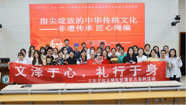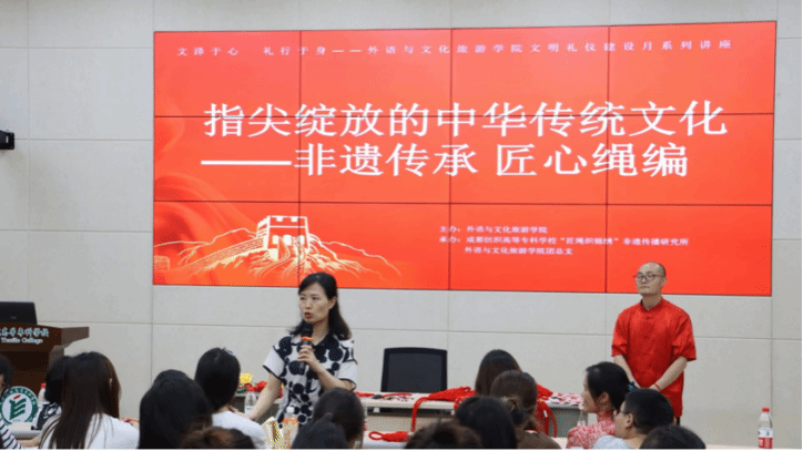 4月17日晚,文旅学院在南苑综合楼一楼会议室举行“文泽于心,礼行于身”文明礼仪建设月讲座——非遗传承,匠心绳编。四川省成都绳编市级非物质文化遗产传承人、成都市民间文艺家协会副主席杨文艺老师应邀主讲。