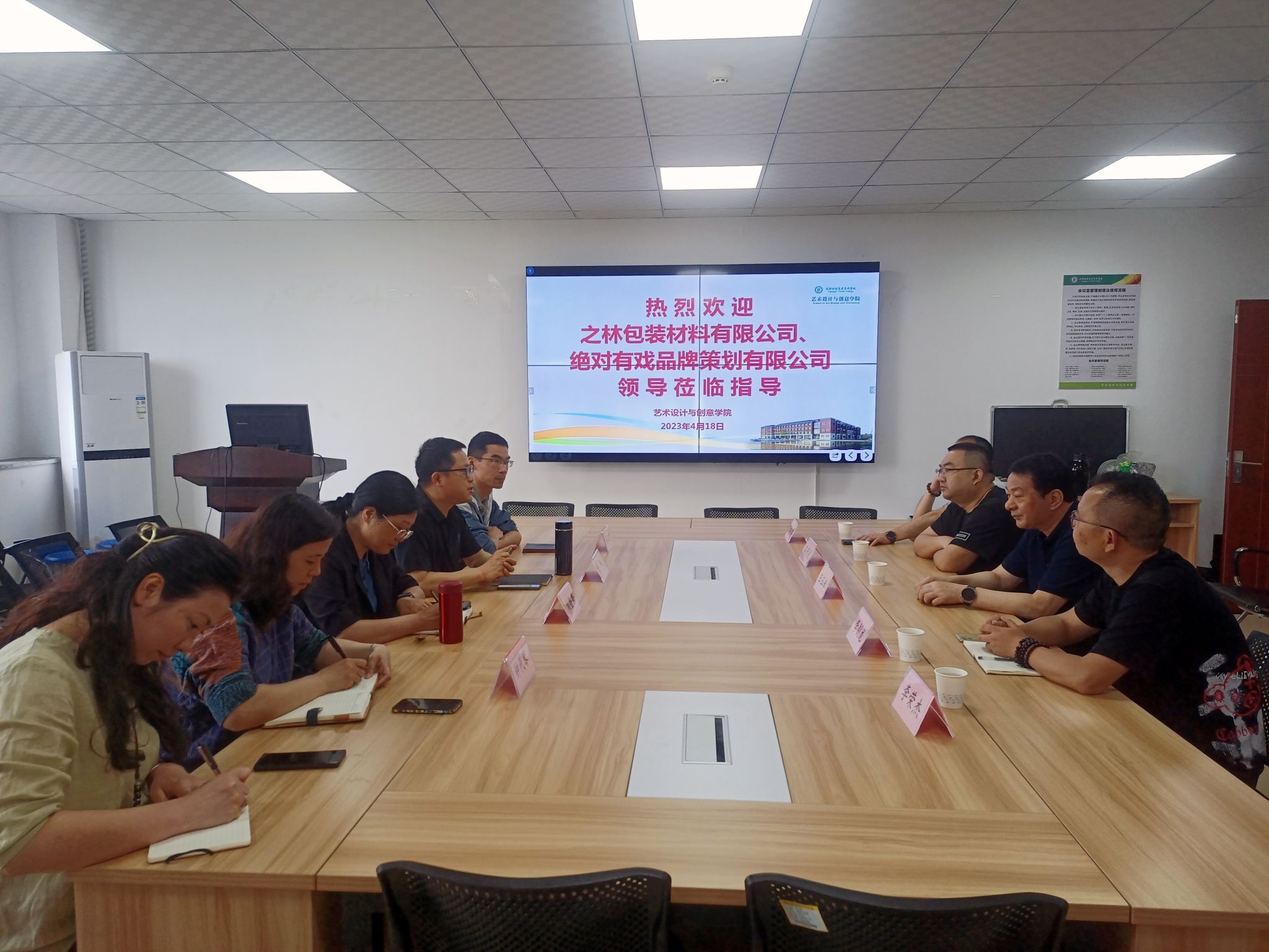 4月18日,成都之林包装材料有限公司总经理王玉来,装潢031班校友、成都市绝对有戏品牌策划有限公司总经理李钊龙一行到创艺学院考察,与学院院长刘畅、党总支书记刘登秀、副院长高汉君、党总支副书记钟代琴、党政班主任徐兴兰和教师魏佳、唐闻等就学生实习实训、毕业生就业等内容进行了深度交流。