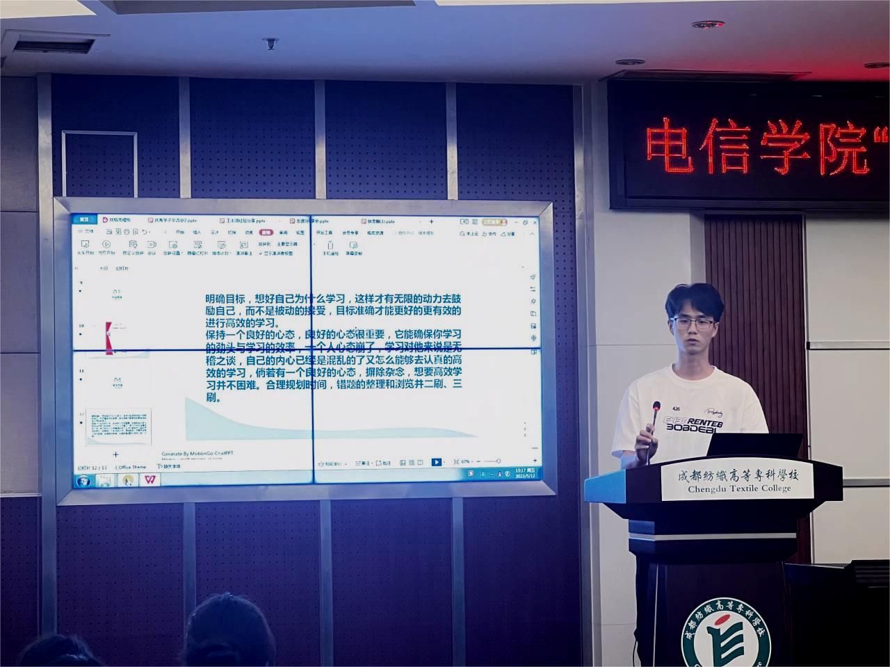 国家奖学金获得者、省级优秀毕业生、省级市场调研一等奖获得者,电商201班王丰鸣同学从学习方法、创新创业、竞赛科研和社会实践等方面作了分享,重点介绍了自己在各类专业竞赛50余项获奖和10余项专利发明的经验。国家奖学金获得者、省级优秀毕业生、“互联网+”创新创业大赛银奖获得者,建电201班左谊同学分享了自己从单招考试擦线录取成长为国奖获得者的学习经历,勉励学弟学妹要无惧起点,只要努力终会有回报。省级“挑战杯”铜奖、省级职业技能大赛风光互补发电系统安装与调试赛项二等奖、1+X光伏运维职业技能等级证书(中级)获得者,电气201班张忠瀚同学分享了自己的求职经验,强调大家要重视平时专业学习、积极参加比赛,为自己未来的求职积攒“本钱”,并且在职业目标选择中要大胆,勇敢尝试将会有意外收获。