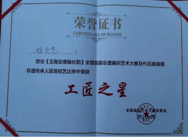 活动由成都市文化广电旅游局、成都市教育局,新都区人民政府主办,以“加强非遗系统性保护,促进持续发展”为主题。我校外语与文化旅游学院企业导师、绳编非遗传承人杨文艺和学院教师杨宗英出席活动,并参加全国首届非遗编织艺术大赛,经过现场技艺比拼,评委匿名评审,杨文艺老师获得“工匠之星”称号,杨宗英老师获得“潜力之星”称号。