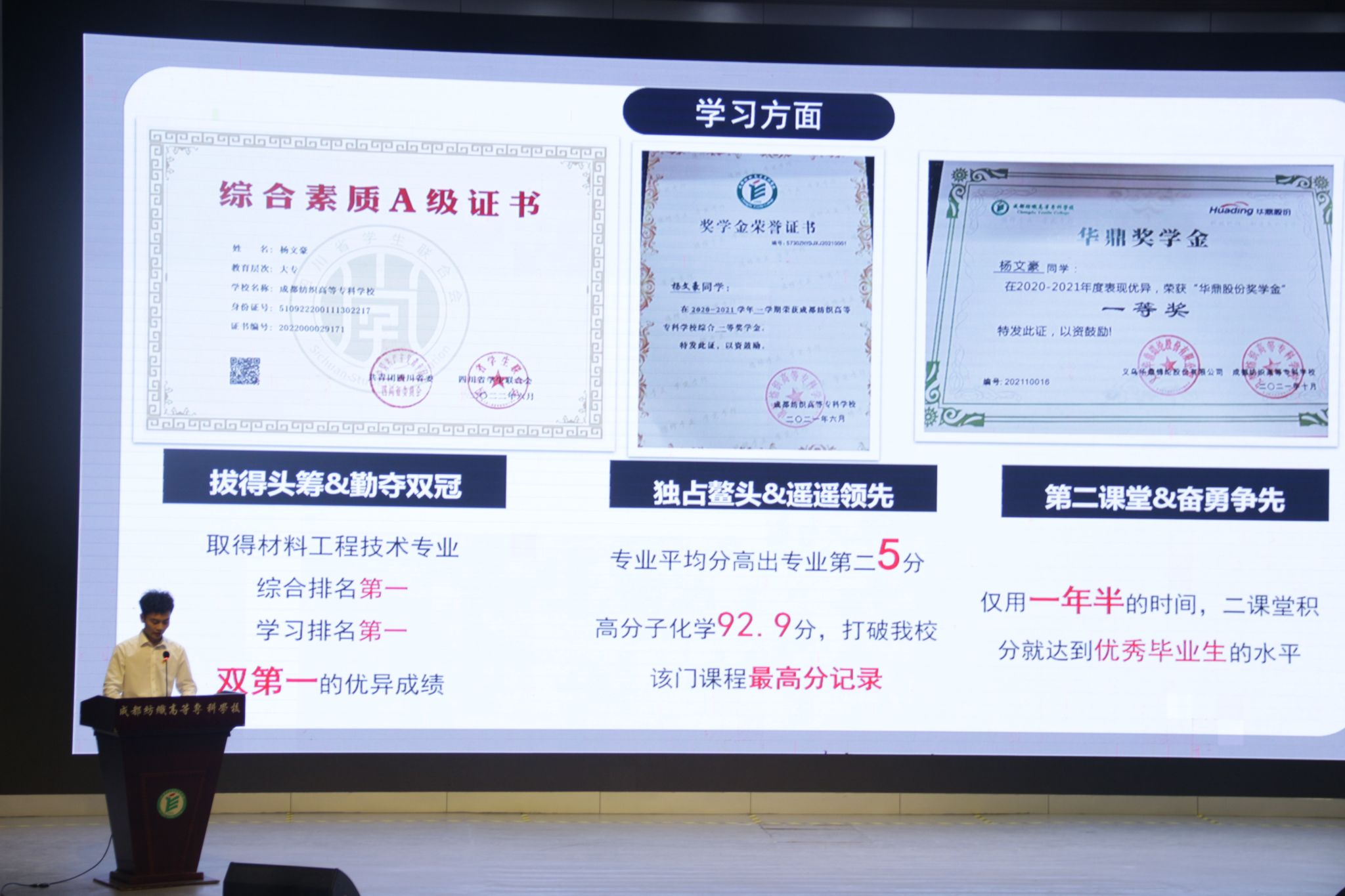 6月14日,轻工与材料学院在多功能厅举行2023年“奋斗青春· 励志前行”优秀学生事迹宣讲大会,学院三位国家奖学金获得者杨文豪、邱静宇、曹慧依次进行成长分享。