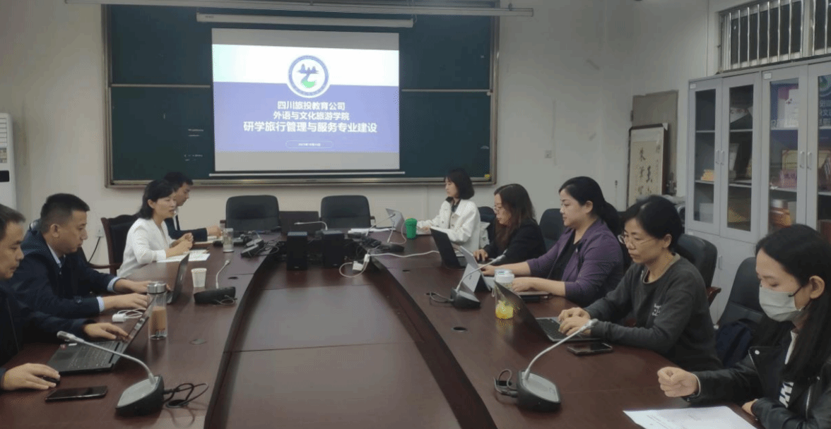 10月24日,外语与文化旅游学院与四川旅投教育投资有限责任公司在南苑致知楼A401召开研学旅行管理与服务专业建设研讨会。川旅投教育产业学院业务中心院校业务总监弓建明一行两人,学院副院长(主持工作)王敏、副院长梁金柱,旅游教研室主任杨婷婷,旅游管理专业负责人陈倩,旅游教研室老师李燕教授、余宜娴副教授参会,研学旅行管理与服务专业负责人彭诗茗主持会议。
