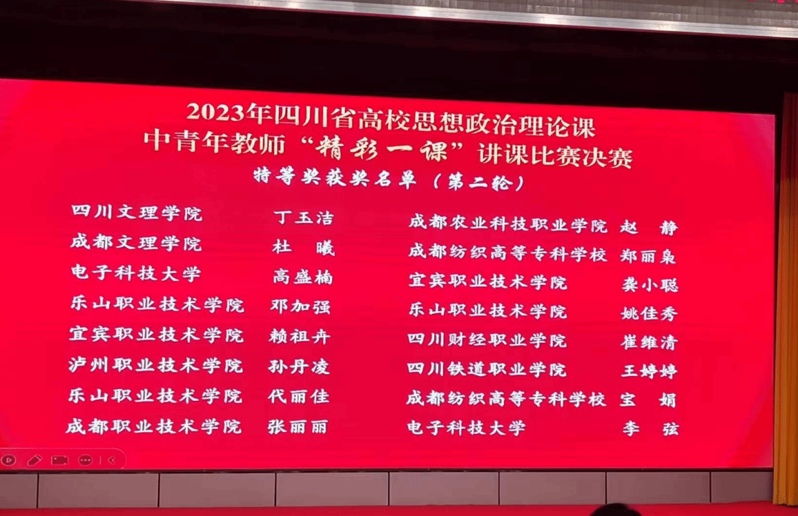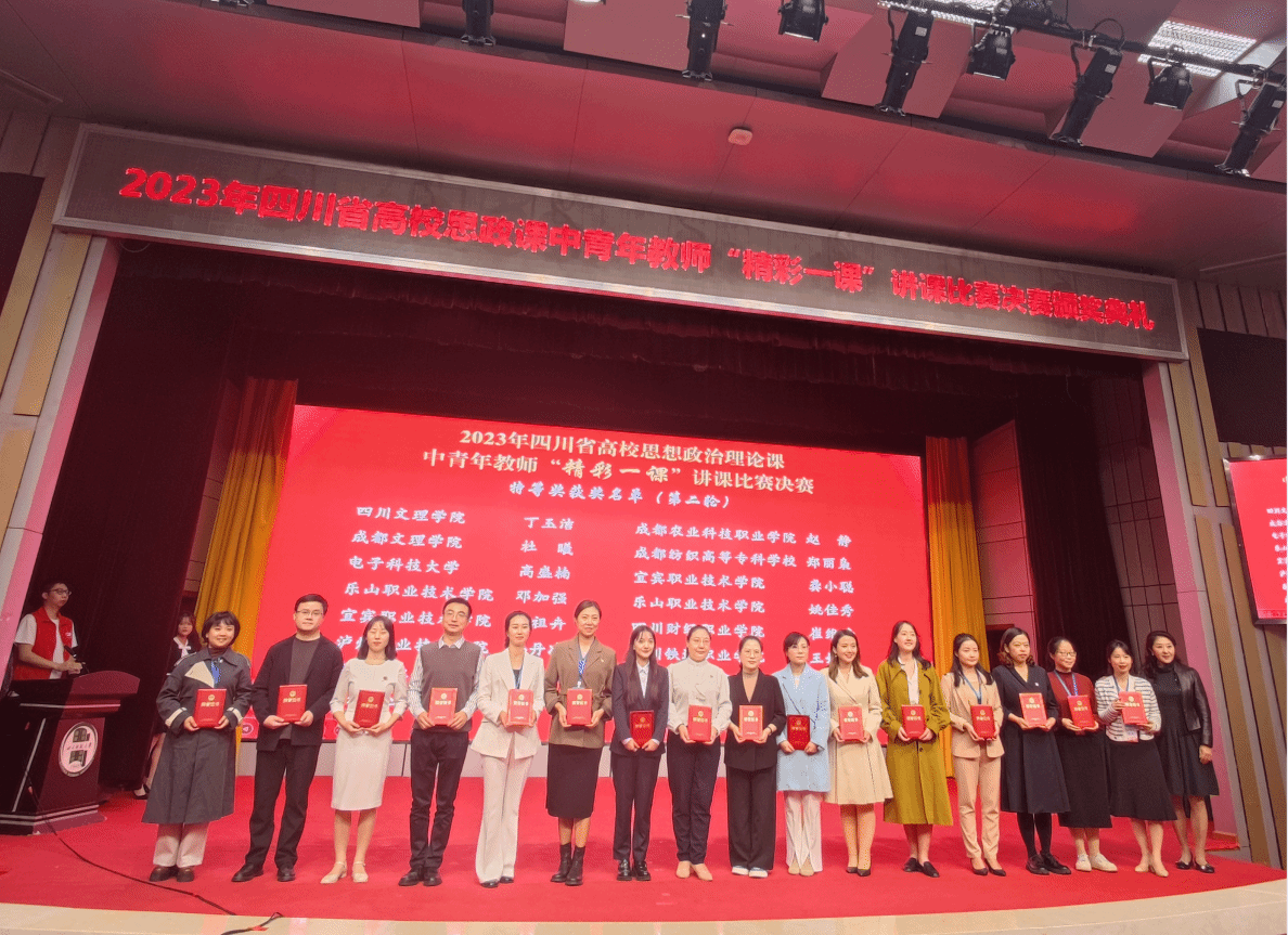 2023年四川省高校思想政治理论课中青年教师“精彩一课”讲课比赛决赛于10月28日至29日在四川师范大学举行,我校马克思主义学院宝娟、郑丽枭两位老师从来自全省本科和高职院校的136名思政教师中脱颖而出,分获形势与政策高职高专组特等奖、思想道德与法治高职高专组特等奖。