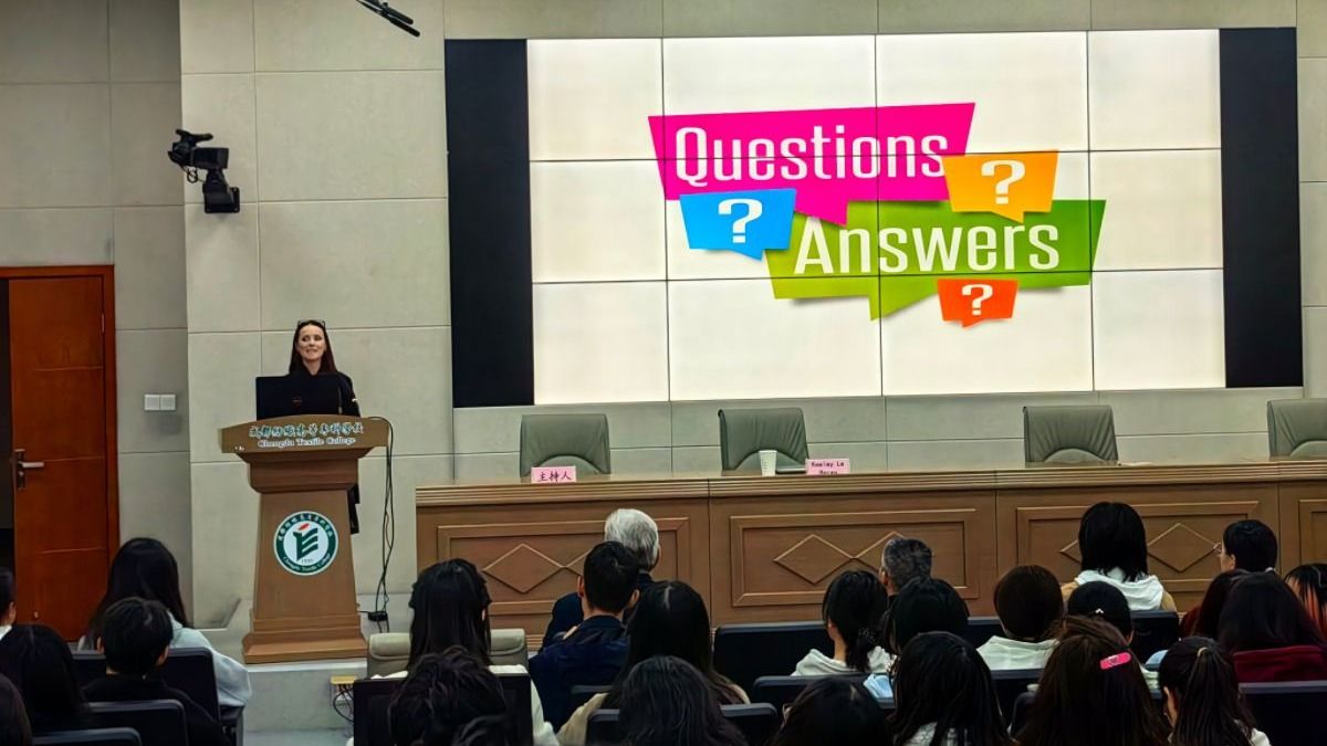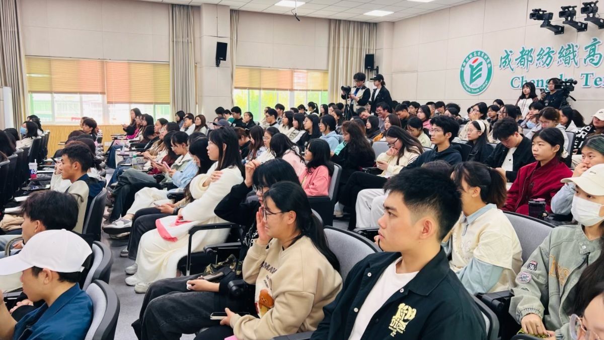 论坛上,学生与两位外籍教师积极互动,就服装的全球化趋势、意大利语学习、出国留学深造等话题进行深度交流。讲座气氛活跃,现场互动热烈,座无虚席。
