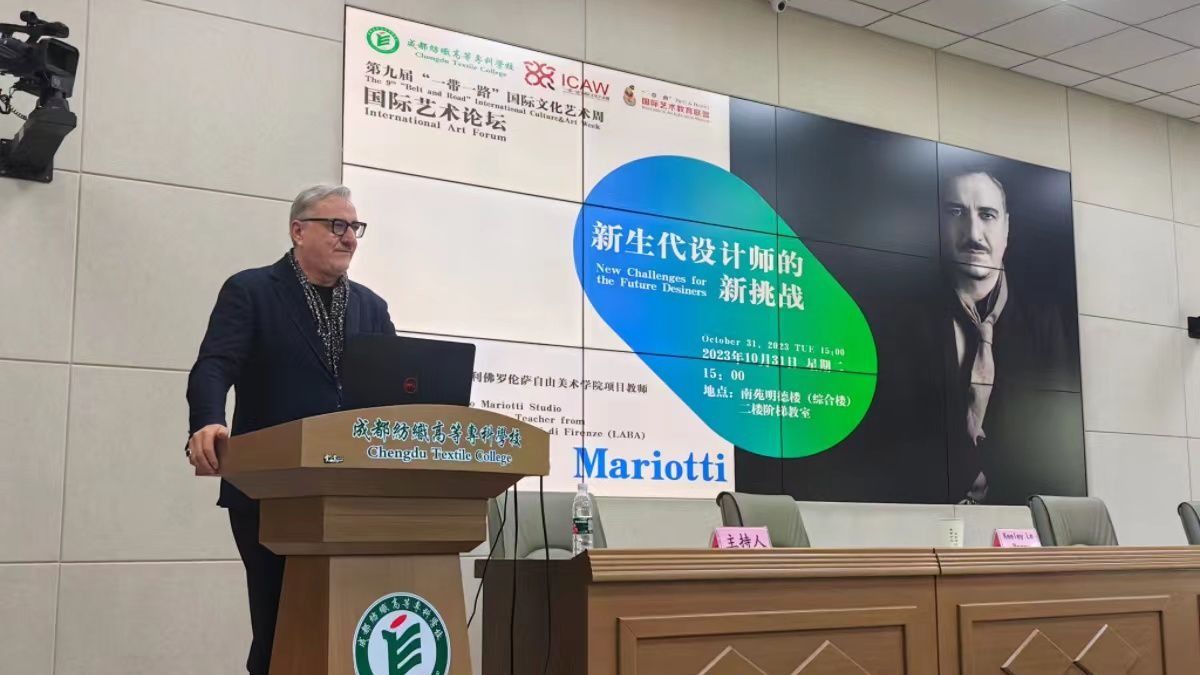 中意合作办学意大利佛罗伦萨自由美术学院项目教师、服装设计师Massimo先生带来“新生代设计师的新挑战”主题讲座。他讲道,意大利作为时尚之都,拥有众多知名服装品牌,而这些品牌都是如何设计、制作、销售,从而被大家所熟知。他指出,在设计中,历史和文化的传承非常重要,比如他在学校体验的蜀绣技艺就是文化传承的表现。新生代设计师处于最好的时代,他鼓励学生多读书了解全球化趋势,多走进博物馆和美术馆,并且不断实践。