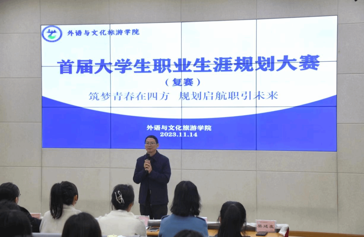 11月14日,外语与文化旅游学院在南苑明德楼一楼X1114开展以“筑梦青春志在四方,规划启航职引未来”为主题的首届大学生职业生涯规划大赛院级复赛。学院党总支书记樊廷友、副院长(主持工作)王敏出席比赛,党总支副书记兼团总支书记王珍珍、专职组织员邓凯艳、专职辅导员蔺珍、蒋平、贾杰雯、王君灵、林凤琴和夏佳担任评委。