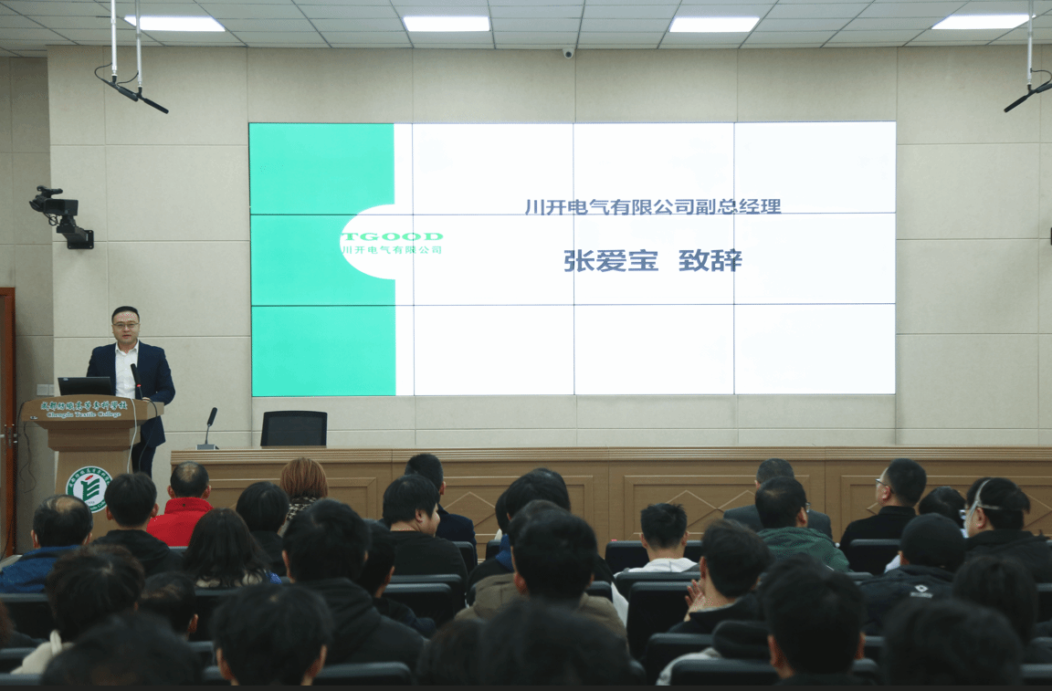 张江婴在致辞中回顾了校企各方前期合作和沟通的成果,以及产业学院成立的基础,充分肯定了川开电气、施耐德电气和卡诺普机器人与学校合作建设输配电装备制造产业学院、推动职业教育高质量发展的共同理念。她指出,输配电装备制造产业学院的建设已列入学校党政重点工作,已经落实建设场地、资金和人员等资源配置,相关工作正有序推进。对产业学院未来发展,她提出三点重要意见:一是统筹兼顾、系统推进,大力促进输配电装备制造产业学院与学校省双高建设项目、产教融合示范项目融合发展;二是抓重点,以点带面推动输配电装备制造产业学院全面发展;三是以制度建设为基石,建立并完善输配电装备制造产业学院保障、运行等机制体制,大力提升内部治理体系和治理能力现代化水平,探索形成符合职业院校类型特色的产教融合、校企合作新模式和新范本。