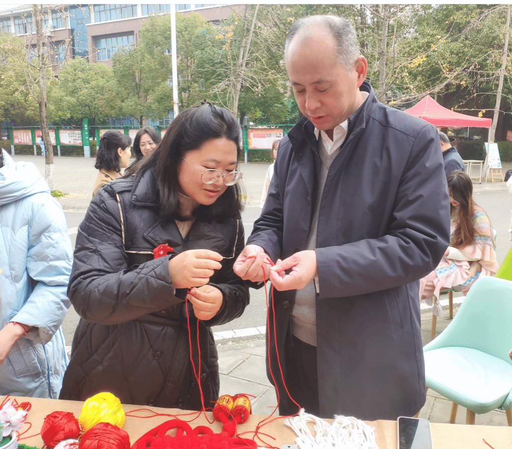 学校党委书记蔡玉波,党委副书记周红,副校长刘莉、蒲冰远来到活动现场进行指导。蔡玉波现场和杨宗英老师一起编织凤尾结手绳,充分肯定了以匠心传非遗的绳编技艺,指出绳编的技艺大部分都是从劳动生活经验中总结出来的,现在经过创新,丰富、美化了我们的生活和环境。他表示,学校“三心双艺”党建工作品牌的“艺”,指的就是师生都要在工作技能之外,多掌握一门这类技艺。他希望同学们将工匠精神融入每一个编织细节。