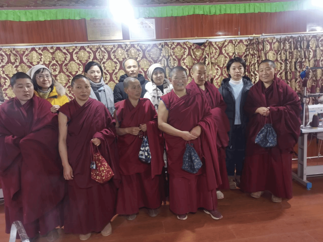 调研团一行走访了阿坝州四洼尼姑寺和甘孜州瓦达觉姆寺、158k觉姆寺等,我校教师对觉姆开展了个性化的纺织产品缝制教学。教学活动在平均3500米的高海拔地区进行,教师们克服寒冷和高原反应等重重困难,向觉姆们传授实用缝制技巧,帮助她们提高了缝制技艺,为他们订制开发了实用性和个性化的纺织产品,还帮助她们建好用好“同心缝纫社”,为她们日后的美好生活奠定了基础。