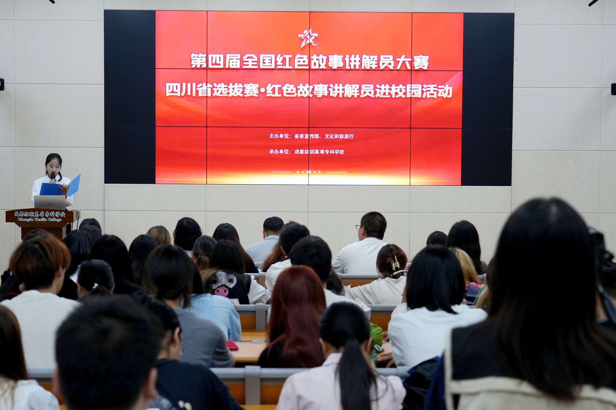 9月18日,第四届全国红色故事讲解员大赛四川省选拔赛·红色故事讲解员进校园活动在综合楼阶梯教室举行。四川省教育厅体卫艺处陈鹏出席,我校党委宣传统战部、文旅学院负责人及100余名学生代表参加活动。