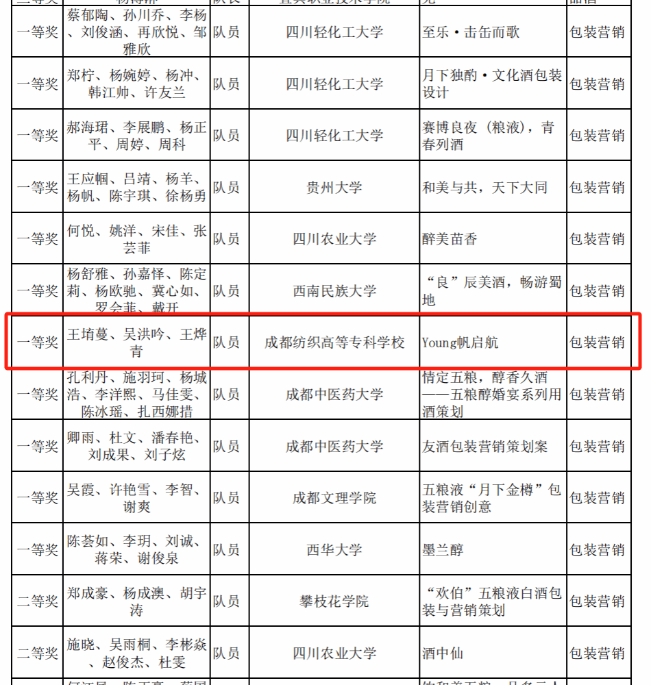 12月28日,2023“五粮液杯”中国大学生酒类创新创意大赛包装营销与酒类创新比赛全国总决赛结果揭晓。经过激烈角逐,我校创艺学院田炜、赵庆老师指导的吴洪吟、王堉蔓、王烨青参赛团队包装营销创意设计作品《young帆起航》入围全国决赛,并取得一等奖佳绩。