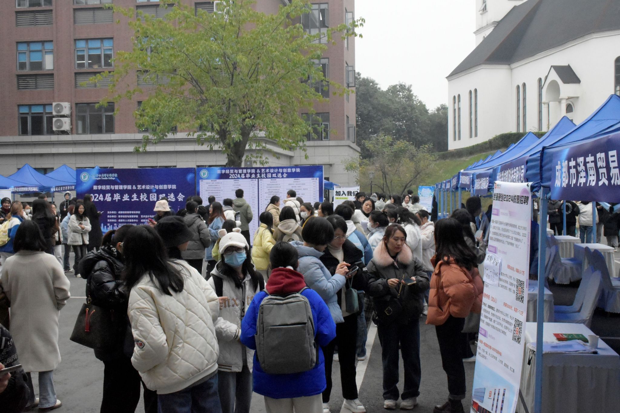 12月28日下午,由数管学院、创艺学院联合承办的2024届毕业生校园双选会在北苑融创楼一楼举行。本次双选会共吸引43家用人单位到会,为2024届毕业生提供近1000个就业岗位;数管学院、创艺学院800余名毕业生到场求职。