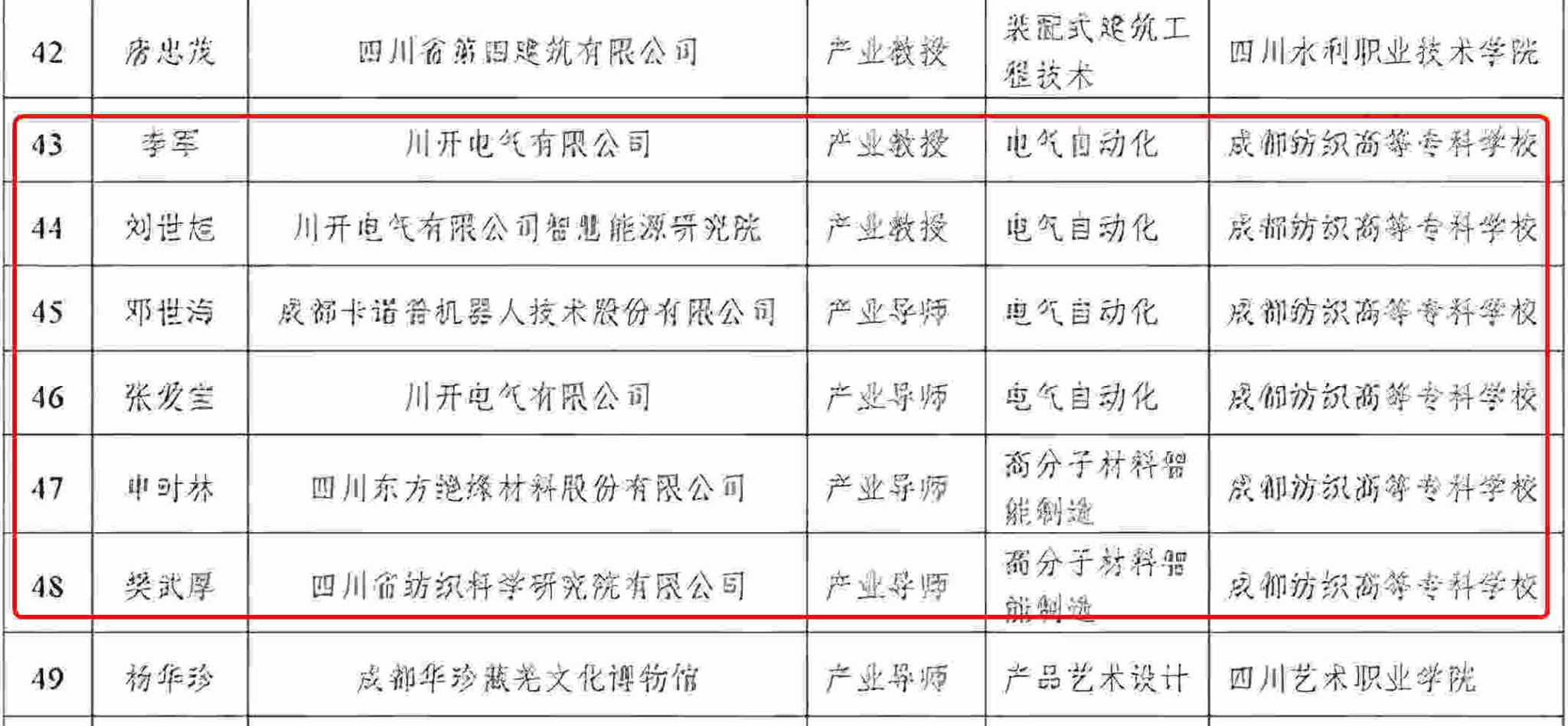 近日,为认真贯彻落实党的二十大精神和《中华人民共和国职业教育法》《关于深化现代职业教育体系建设改革的意见》等文件精神,成都市教育局组织开展了成都市产业教授(导师)选聘工作。我校电气信息工程学院、轻工与材料学院聚焦产业龙头企业,积极组织企业满足条件的领军人物进行申报,最终,来自川开电气有限公司的李军、刘世旭被聘为我校电气自动化专业产业教授,来自成都卡诺普机器人技术股份有限公司的邓世海、来自川开电气有限公司的张爱宝被聘为我校电气自动化专业产业导师,来自四川东方绝缘材料股份有限公司的申时林、来自四川省纺织科学研究院有限公司的樊武厚被聘为我校高分子材料智能制造专业产业导师。