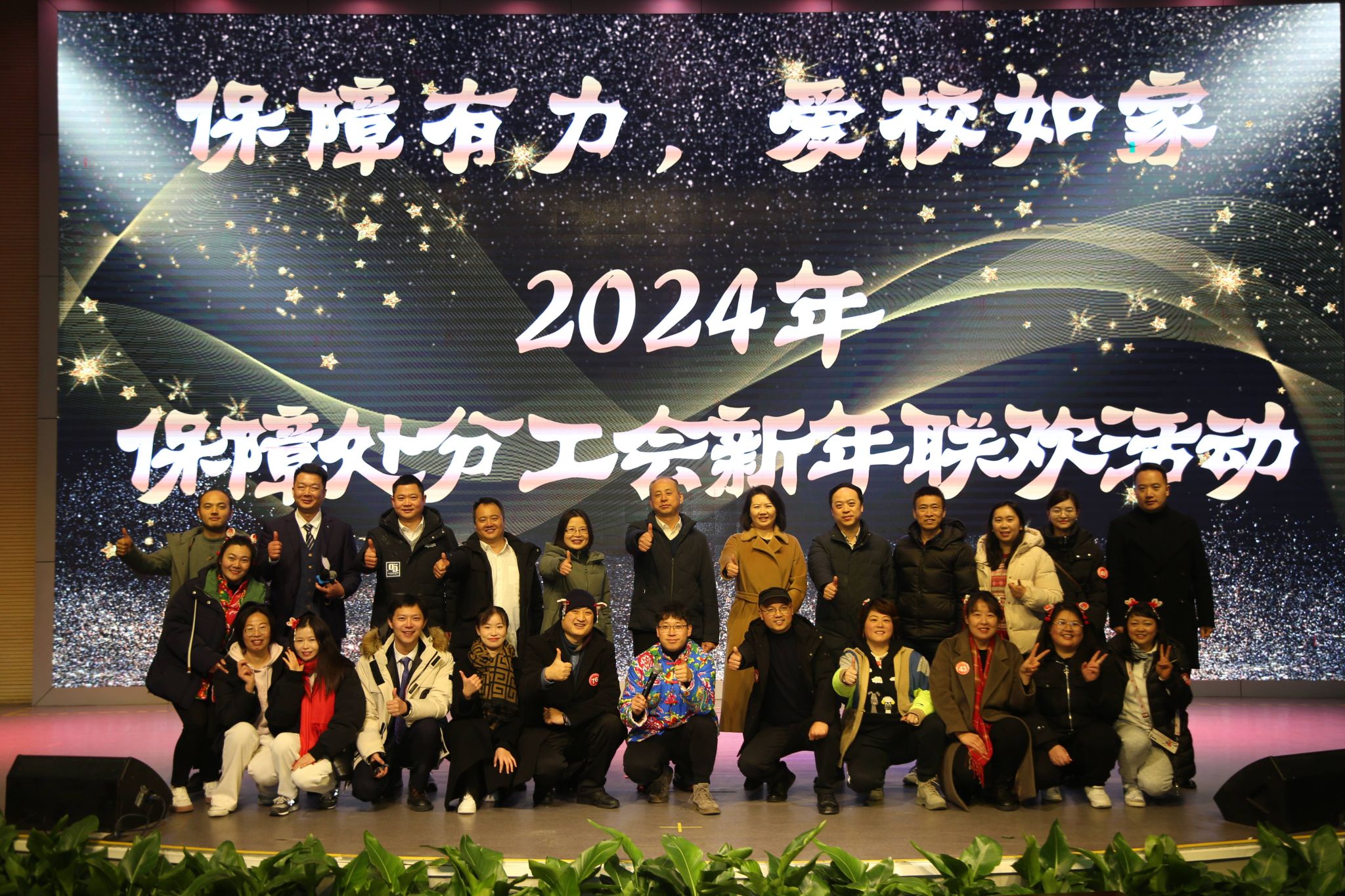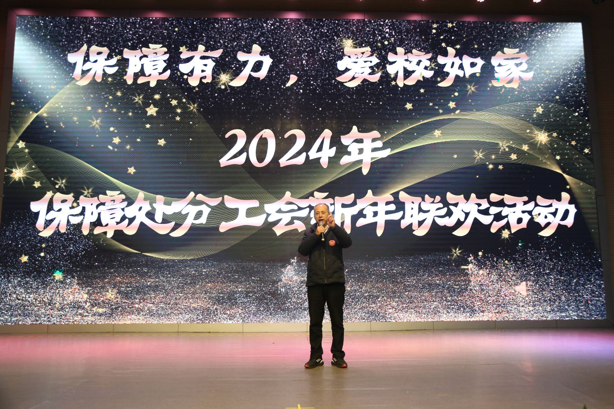 1月21日下午,保障处分工会新年联欢活动在学校南苑双艺厅隆重举行。活动以“保障有力,爱校如家”为主题,学校党委书记蔡玉波,党委常委、副校长刘莉,兄弟部门在校中层干部和教职工应邀出席,与保障处全体教职工齐聚一堂,欢庆新年。