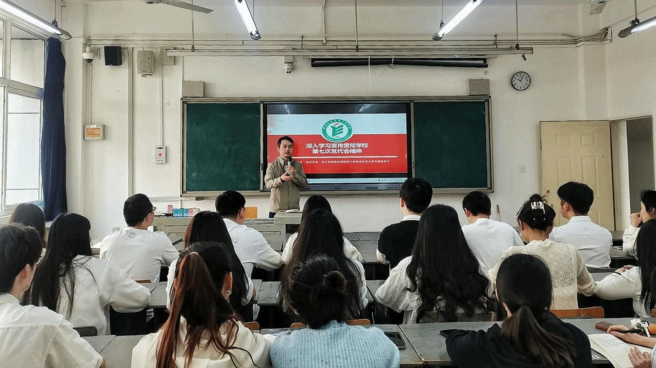 李华指出,学校第七次党代会是在奋力推进国家和省“双高计划”建设,全面创建成都轻纺工程职业技术大学新征程上,召开的一次十分重要的大会。他从党代会的主题、学校第六次党代会以来工作回顾、全面开启创建职教本科新征程、持续推进党的建设新的伟大工程等方面,结合同学们的学习、生活和工作实际,进行了全面宣讲和深入解读。并对同学们提出三点希望:一是要有目标。要以学校的“升本”目标为导向,积极谋划个人的发展目标,高扬理想信念之帆,奋力实现发展新跨越。二是要有信心。创建职教本科是每一位成纺人多年来的梦想,如今梦想已近在眼前,希望全体同志要满怀信心,相信明年一定能以优秀校友的身份,迎接母校的新局面。三是要有行动。要把学习贯彻与个人实际紧密结合,坚持个人发展与学校发展相一致,坚持不懈地奔赴更好的未来。
