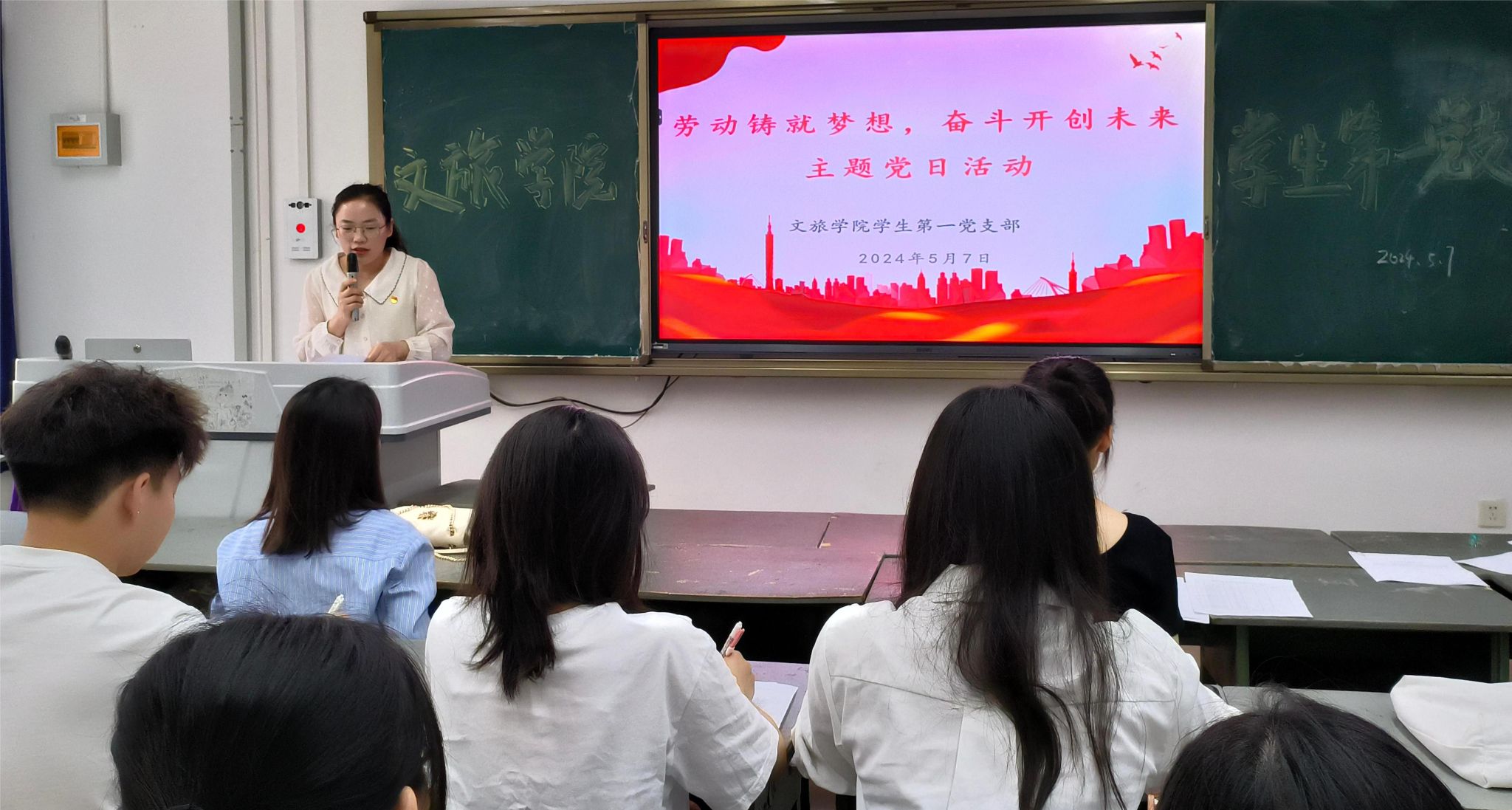 5月7日,文旅学院第一党支部在致知楼A501开展“劳动铸就梦想,奋斗开创未来”党日主题活动,弘扬劳动精神、增强劳动意识,引导广大学生崇尚劳动、尊重劳动、热爱劳动,争做新时代的奋斗者。学生支部委员、全体学生党员和入党积极分子参加活动,活动由学生党支部书记蒋平主持。