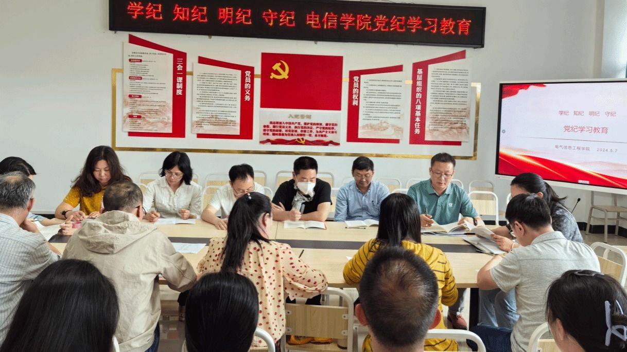 5月7日,电信学院教工党支部在笃行苑C410会议室围绕“学纪、知纪、明纪、守纪”开展党纪学习教育专题学习,传达中共中央办公厅《关于在全党开展党纪学习教育的通知》和学校党委理论学习中心组学习研讨(扩大)会精神。学习由电信学院党总支书记姚玲峰主持。