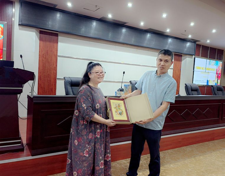 在现场热烈有序的互动环节中,师生们踊跃发言,桩桩女士对师生们的问题均做了热情耐心的回答。桩桩女士和王永忠先生还分别进行了代表作《蜀锦人家》和《凉山之鹰》的签名赠书活动。马德坤老师代表学校向桩桩一行回赠了织绣技艺非遗数字化保护与传承四川省文化和旅游厅重点实验室制作的蜀锦工艺品。