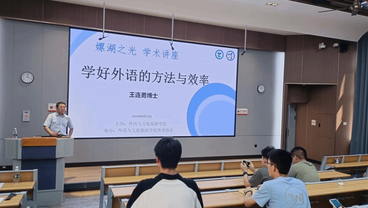 6月11日下午,外语与文化旅游学院“嫘湖之光学术讲座——学好外语的方法与效率”在致知楼C104举行。讲座由文旅学院外语协会社团承办,西南大学经济管理学院旅游系教师王连勇博士应邀主讲,文旅学院副院长(主持工作)王敏、杜玮老师和外语协会指导老师许梦雪出席活动。