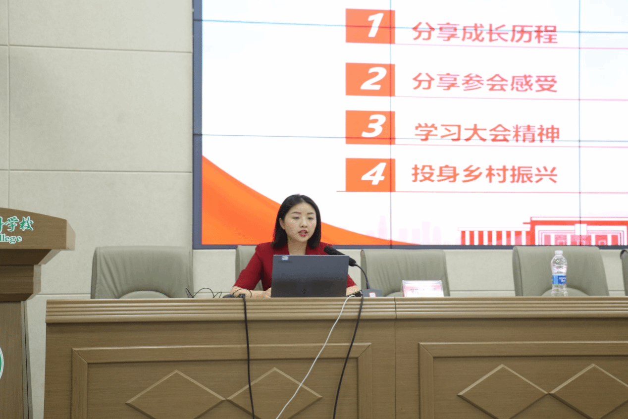 邓小燕分享了她参加党的二十大和团的十九大的经历,并带领师生共同学习党的二十大精神、团的十九大精神和国家乡村振兴战略。她表示:“青年强、则国强,广大青年要坚定不移听党话、跟党走,怀抱梦想又脚踏实地,投身到祖国和人民需要的地方去!投身到乡村振兴的广大天地中去!”