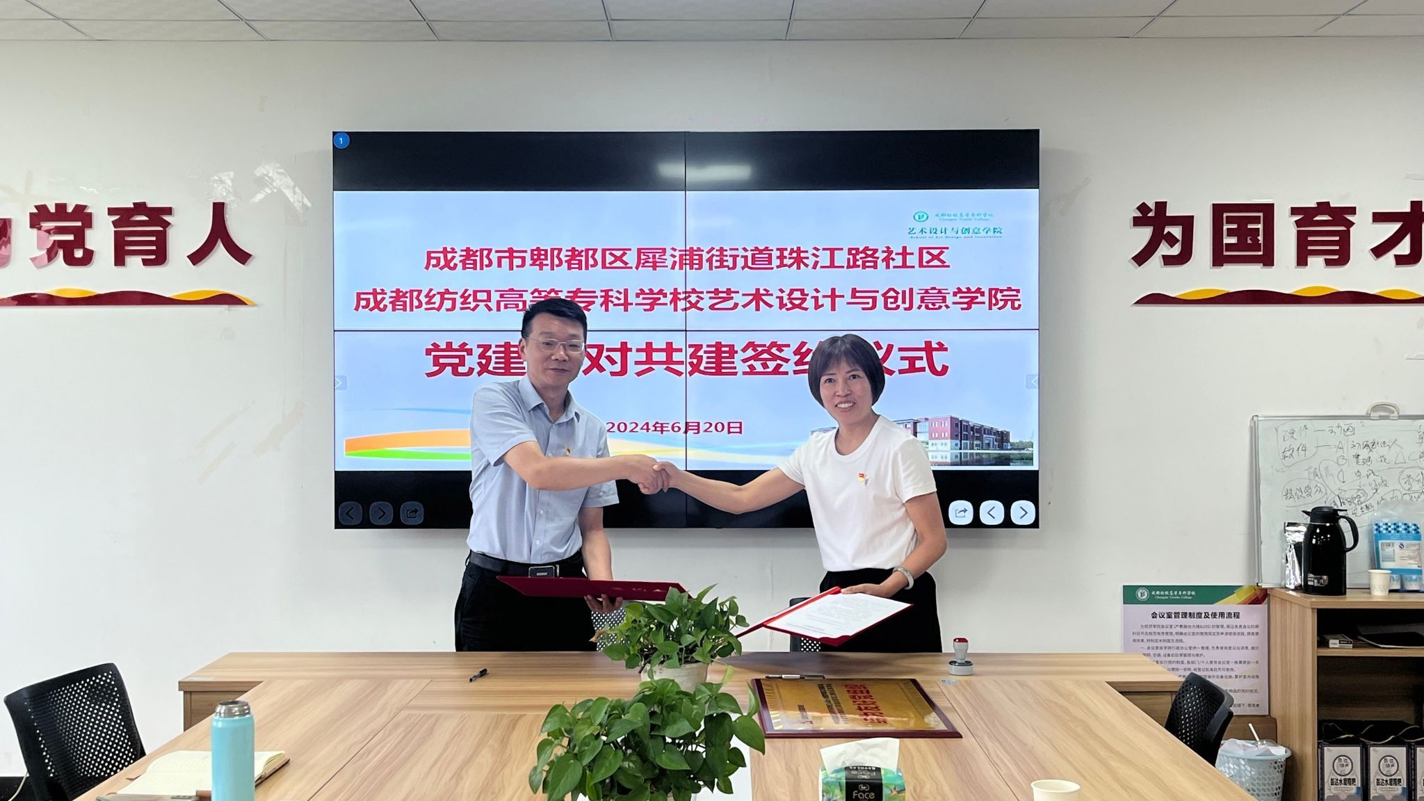 6月20日,创艺学院与犀浦街道珠江路社区签署党建结对共建协议,相约携手构建优势互补、资源共享、共同发展的基层党建工作新格局。创艺学院党总支书记王坤、珠江路社区党委书记钟奇华签署协议。创艺学院院长刘畅、党政办主任徐兴兰、专职组织员孔超出席签约仪式。