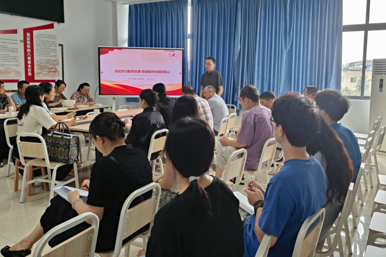7月2日,电信学院党总支开展“把遵规守纪刻印在心”党纪学习教育专题党课学习。党课由学院党总支书记姚玲峰主讲,学校党委组织部组织科科长卢颖,电信学院教工支部、学生支部全体党员参加学习。