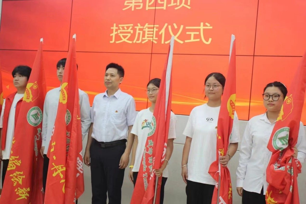 徐瑾介绍学校2024年暑期“三下乡”社会实践活动总体安排后,蒲冰远、徐瑾、王歆为各实践队伍授旗,志愿者胡雯丽带领志愿者们进行了集体宣誓。