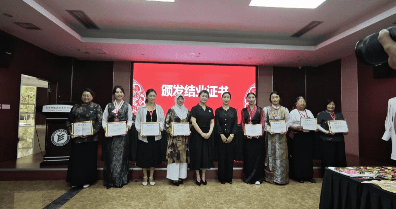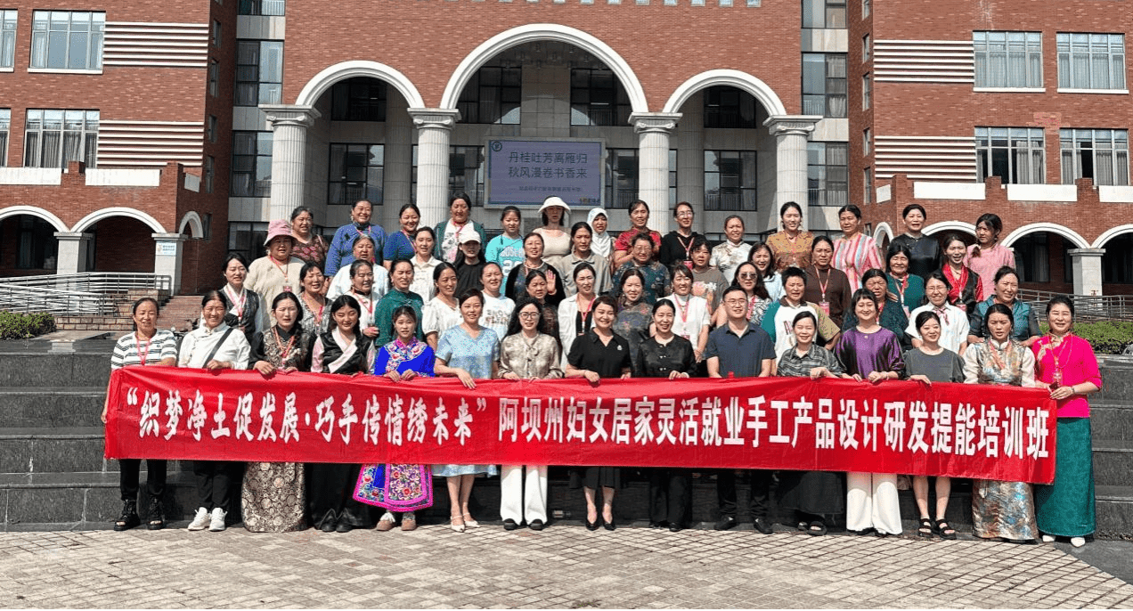 9月11日,“织梦净土促发展·巧手传情绣未来”阿坝州妇女居家灵活就业手工产品设计研发提能培训班圆满结业。阿坝州妇联党组成员、主席向秋杰,阿坝州妇联党组成员、副主席王孝莉,川网传媒集团产业拓展中心首席市场官刘东,我校服装工程与设计学院党总支书记太扎姆、院长李晓岩以及培训指导教师胡毅、庞君薇、马泽群等出席了结业仪式。