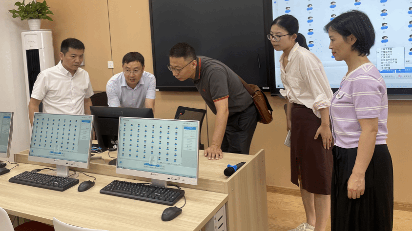 文旅学院副院长(主持工作)王敏和相关工作人员陪同温黎明参观了国际商务与文化传播实训室、酒店前厅数字化运营实训室、AI智能模拟导游实训室、研学产品开发智慧实训室、专业语音室以及公共外语语音室。