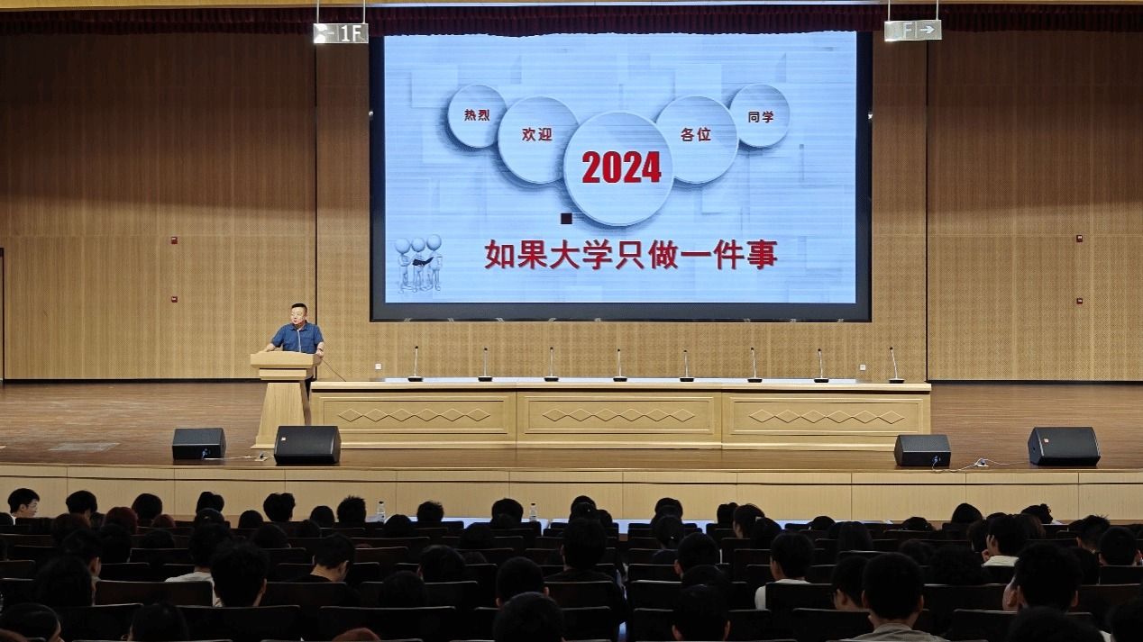 院长秦朝昭代表学院全体师生热烈欢迎2024级新生加入建环学院大家庭,介绍了学校、学院、专业等情况,从品德、能力、学习、交际四个维度,教育引导新生如何开启大学学习生活。