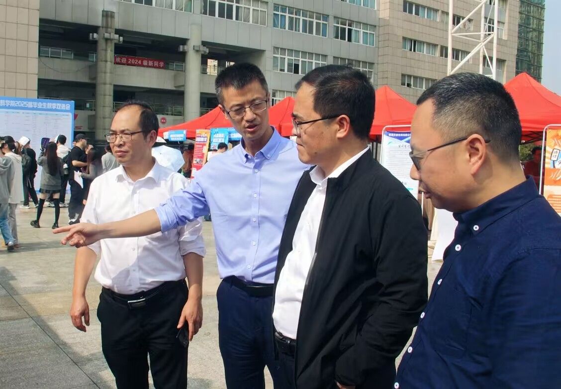 副校长李明富,轻材学院党总支书记申昕、常务副院长蒋旎,学创处副处长刁家志来到双选会现场,与用人单位和师生亲切交流,了解用人单位人才需求、招聘计划、岗位设置、报名人数等情况;听取他们对学校人才培养、实习实践、校企合作、产教融合等方面的意见建议;询问参会学生求职进展,勉励其树立求职信心,积极投递简历。