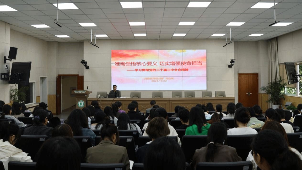10月22日下午,党委宣传统战部部长史在宏应服装工程与设计学院邀请,作党的二十届三中全会精神学习专题党课讲座。讲座在明德楼二楼阶梯教室召开,服装学院教工支部、学生第一支部、第二支部的师生共计100余人参加学习。