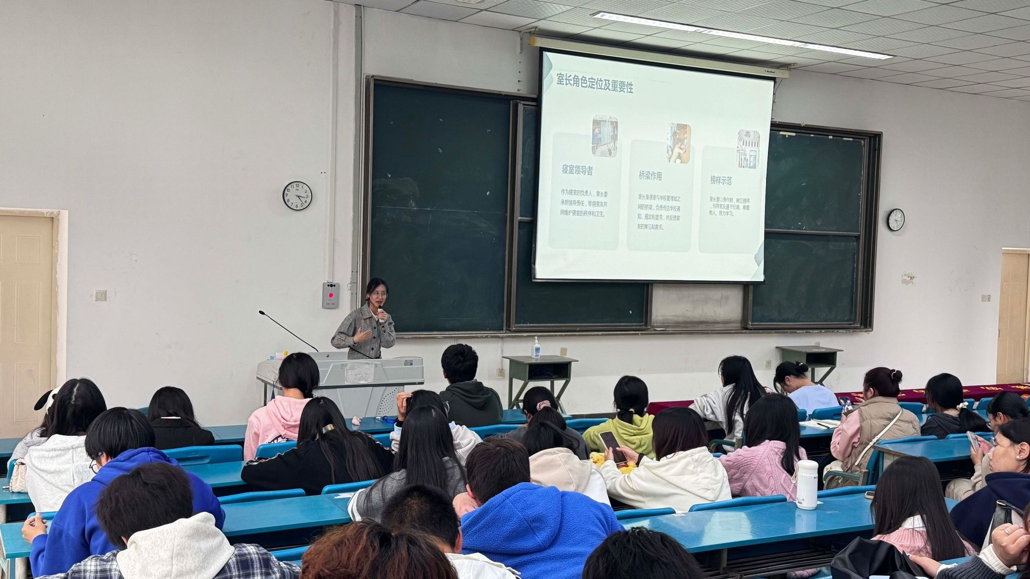 曾燕老师讲解了寝室安全管理、寝室卫生、室长职责和纪律要求。她借助一个个鲜活的寝室安全案例,让同学们深刻认识到寝室安全的重要性;详细介绍寝室卫生、纪律管理等方面的要求,希望同学们努力营造团结温馨的寝室氛围,树立良好的安全意识,构建文明和谐、安全舒适的寝室环境。