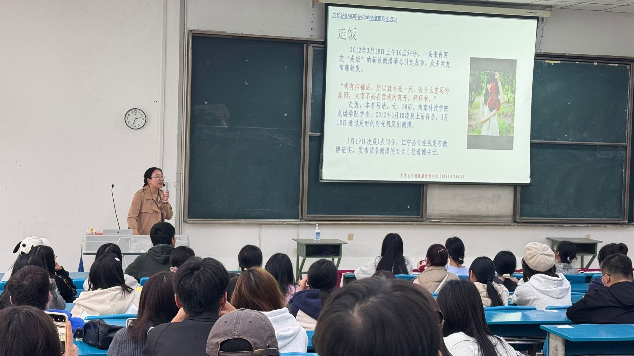 苏乔波以生动的案例和深入浅出的讲解,为同学们解读了大学生常见的心理问题,详细介绍了心理疾病的识别、疾病诊断以及如何有效应对和处理。苏老师强调,心理委员和寝室长应担当起关怀同学的职责,做最温暖的陪伴者,善于观察同学、室友的情绪变化,及时给予关心和支持,积极宣传心理健康的重要性,在学校和同学之间架起桥梁。