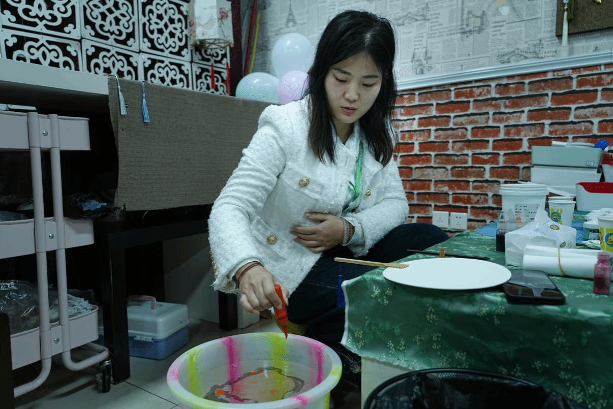 图4 校友成都宏冠服饰有限公司孙丽(服艺113班)在匠心工坊体验非遗手作