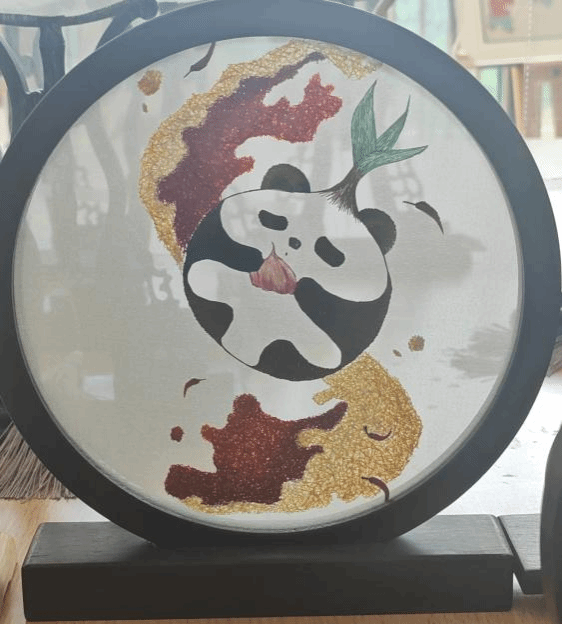 展览中,单面绣佳作《孔雀》以蜀绣传统晕针技法为笔,精妙勾勒出版画般的层次肌理,刚柔并济的针脚将孔雀翎羽的华美展现得淋漓尽致。双面绣《洋葱熊猫》大胆突破传统双面绣的题材边界,将憨态可掬的国宝熊猫与充满生活气息的洋葱元素巧妙融合,灵动鲜活,趣味横生,令人眼前一亮。一幅幅展品独特的创意、精湛的绣工相得益彰,引得参观师生纷纷驻足,赞叹之声此起彼伏。