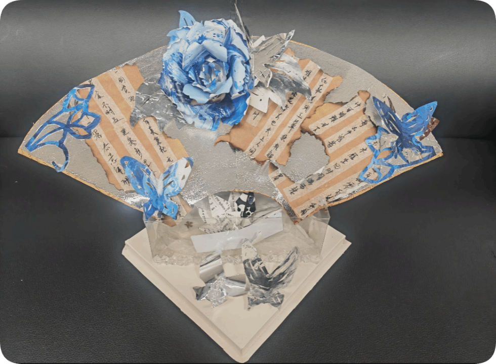 91611寝室黄静蕾同学制作的“幽蓝秘笺”荣获一等奖。蓝色纸花与古文书笺融合,花影绰约,精巧的结构设计和环保理念获得评委一致好评。她分享作品时谈道:“在动手制作时,挑战与惊喜并存,过程中遭遇结构不稳、设计修改等问题,但通过摸索与调整去碰撞新的灵感,最终呈现出完整的作品,这种创新设计带给自己满满的成就感。”