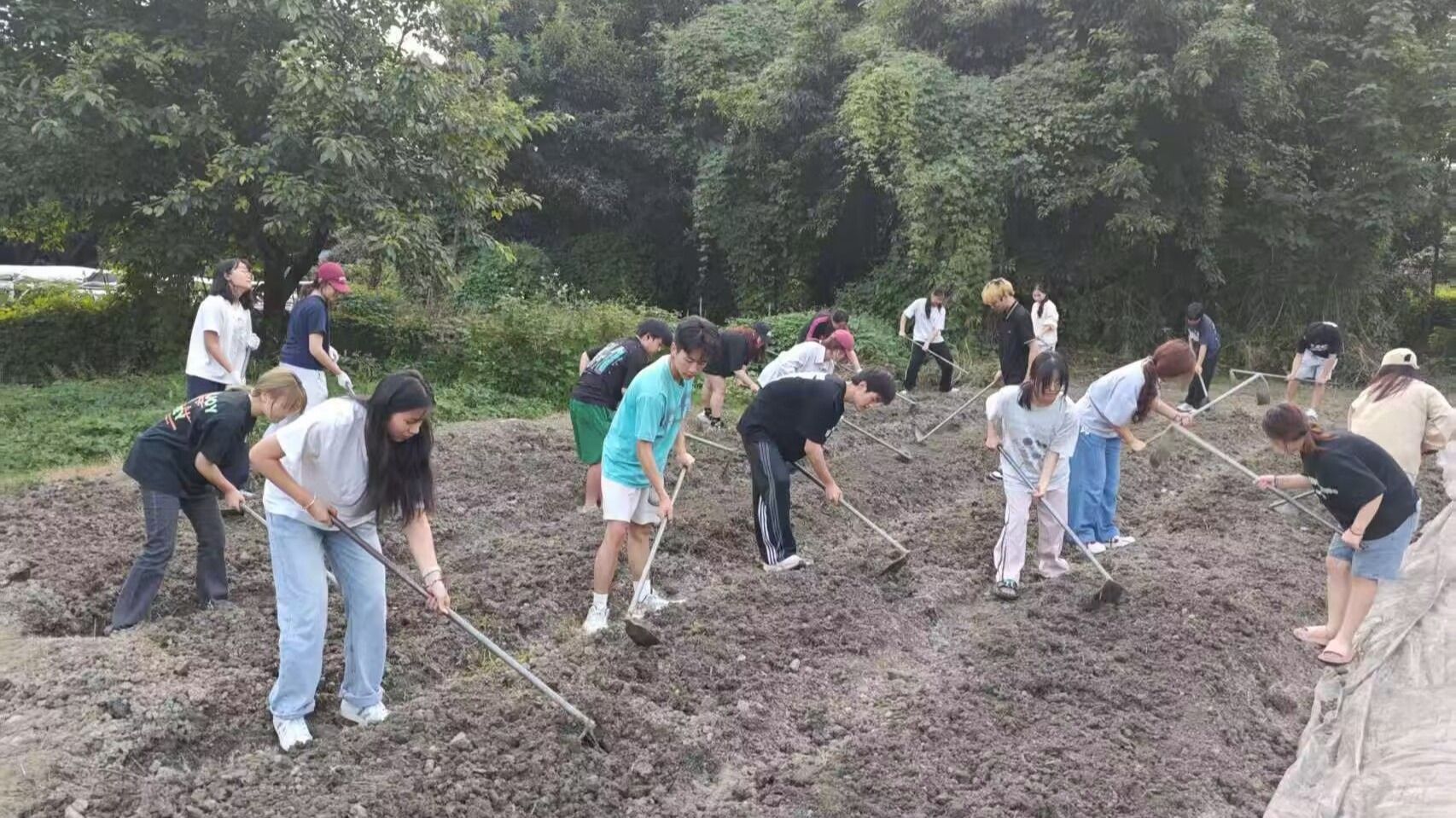 9月23日,为迎接油菜苗播种,冉老师带领学生对闲置土地板结坚硬、碎石杂草混杂的情况进行分工协作整理:女生弯腰松土,男生挥锄挖埂,双方配合敲碎土块、清理杂物。经过两小时奋战,土地重焕松软平整的生机。