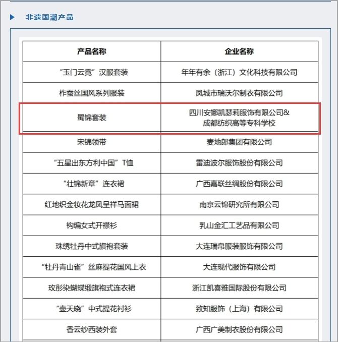 近日,工业和信息化部消费品工业司发布“2025年度十大类纺织创新精品”名单。我校与四川安娜凯瑟斯服饰有限公司联合研发的“蜀锦套装”成功入选,成为本年度名单中唯一有高校参加的获奖产品,体现了我校在纺织非遗传承与创新领域的领先实力与示范作用。