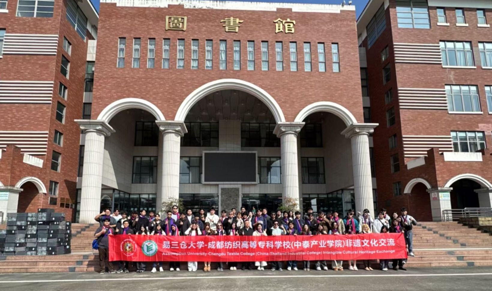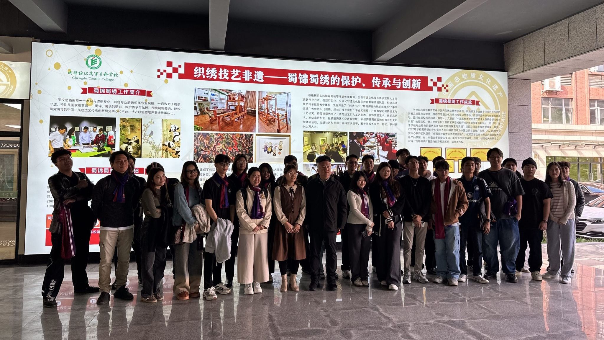10月27日,应学校智能建造与环境工程学院之邀,泰国易三仓大学54名学生及6名教师到访我校,对四川省织绣技艺非遗数字化保护与传承重点实验室的蜀绣、蜀锦展厅进行了深入探访。建环学院党总支书记鲜金宏、留学生辅导员黎媛、专任教师汤萌等全程参与接待。